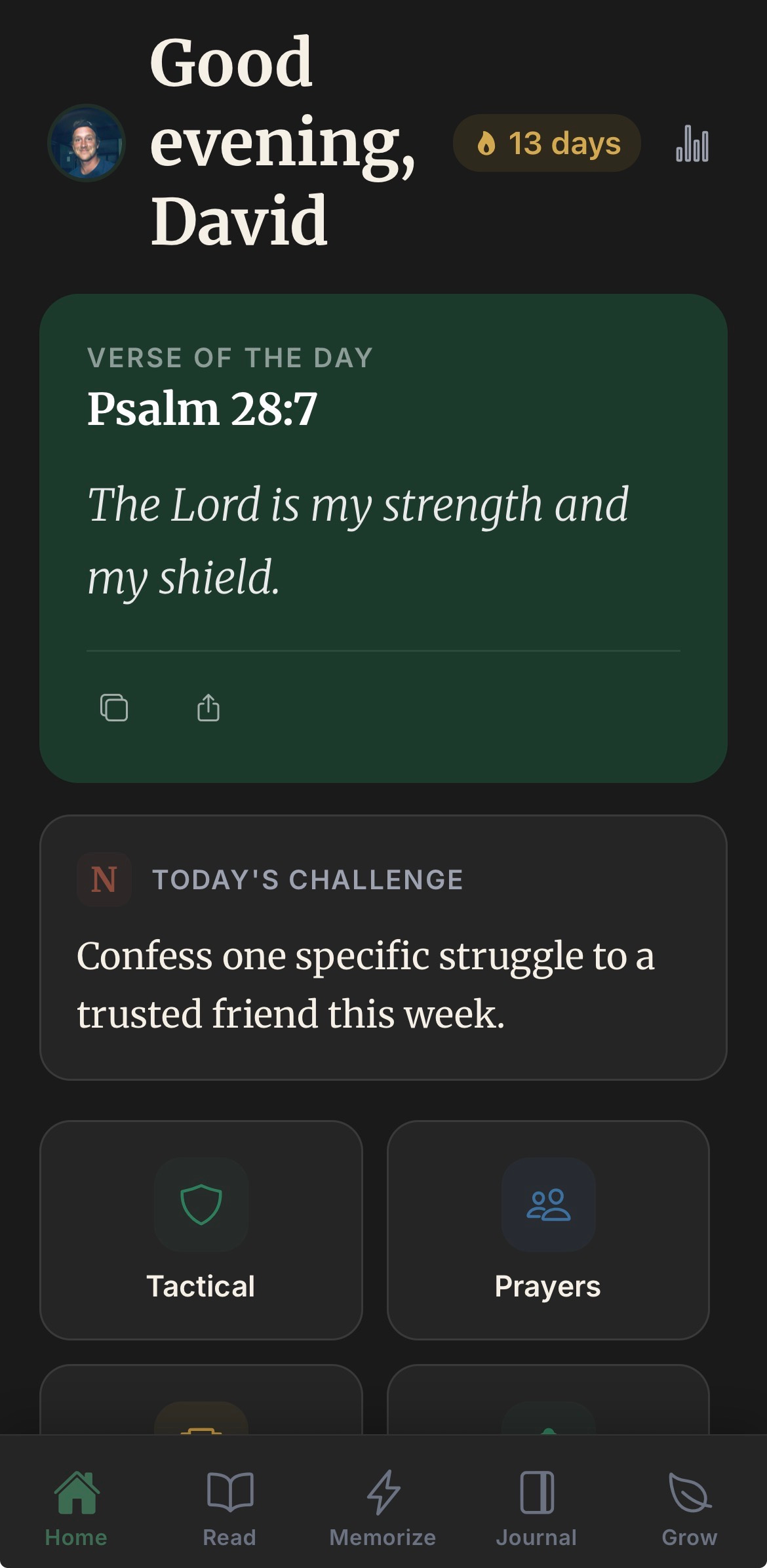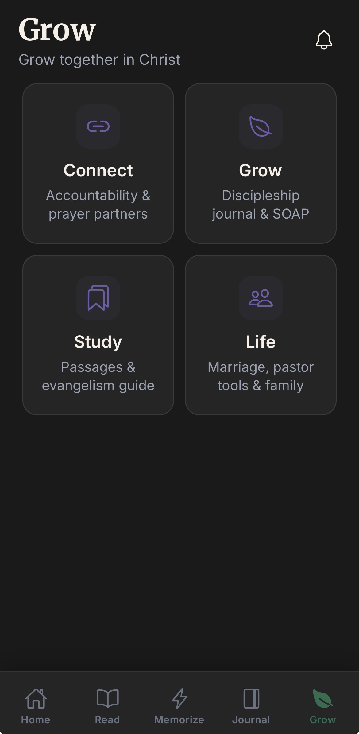 The Cling app is broken down into 4 categories: Read, Memorize, Journal, and Grow.