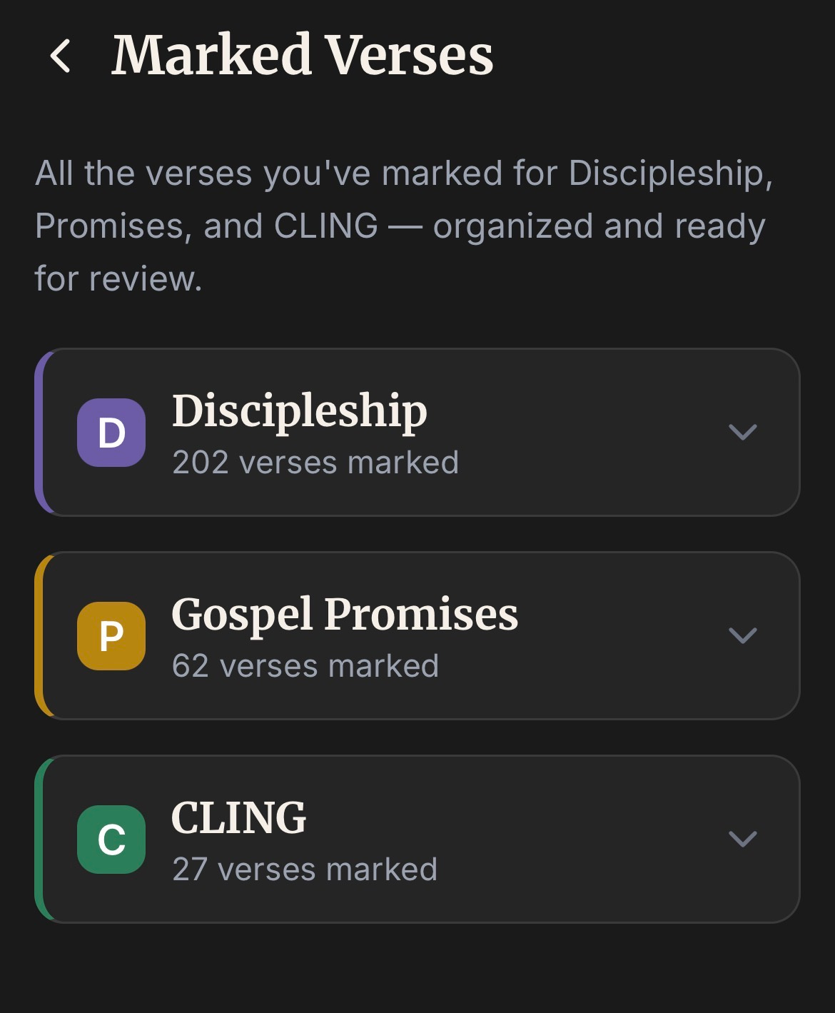 In the read tab you will notice a marked verses tab. This tab are verses you mark as: D: Discipleship, G:Gospel, or C:Cling.