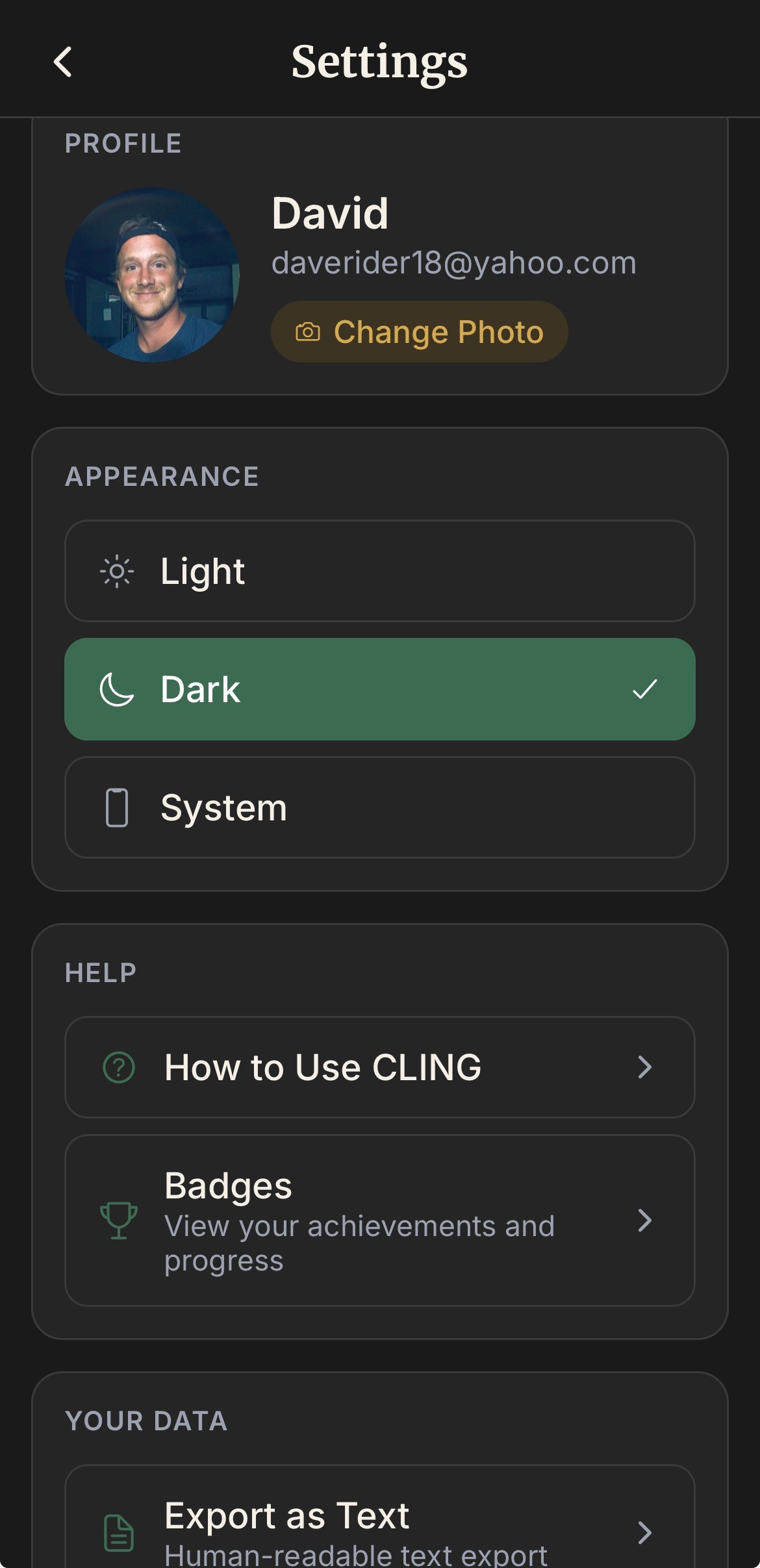 Here is where you can change your picture, switch from light to dark mode, export all your notes that you accumulate while using the app (This is a very great feature and most apps don’t allow this), and where you can contact me and even suggest features!