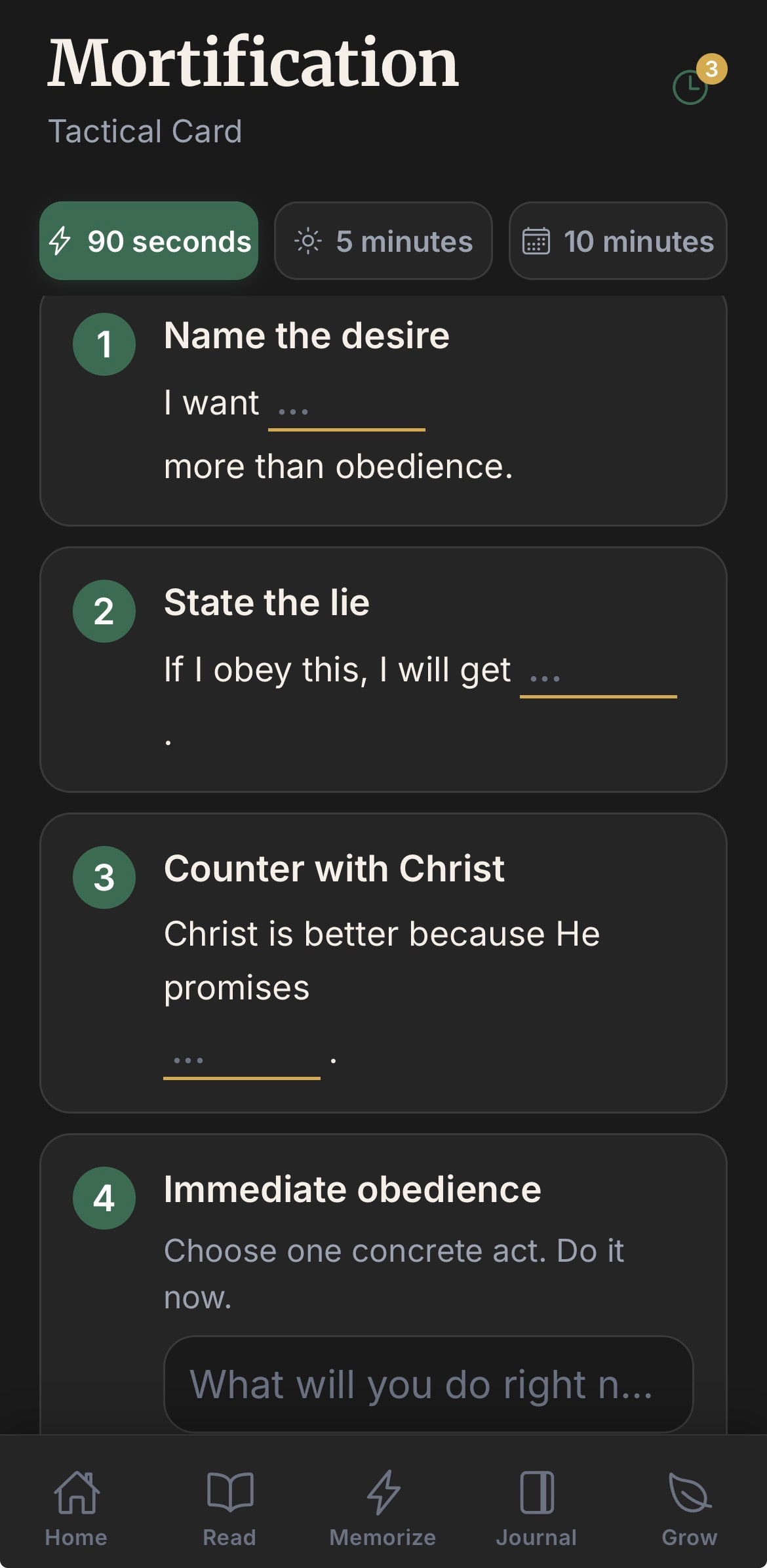 Tactical: This is the place to help you notice where sin is continually being a problem in your life. It will ask you simple questions and then ask you how Christ is better. These are saved throughout your week so that you can see patterns in your life. This is a practical tool and inspired by John Owen who said, “kill sin or it will be killing you.”