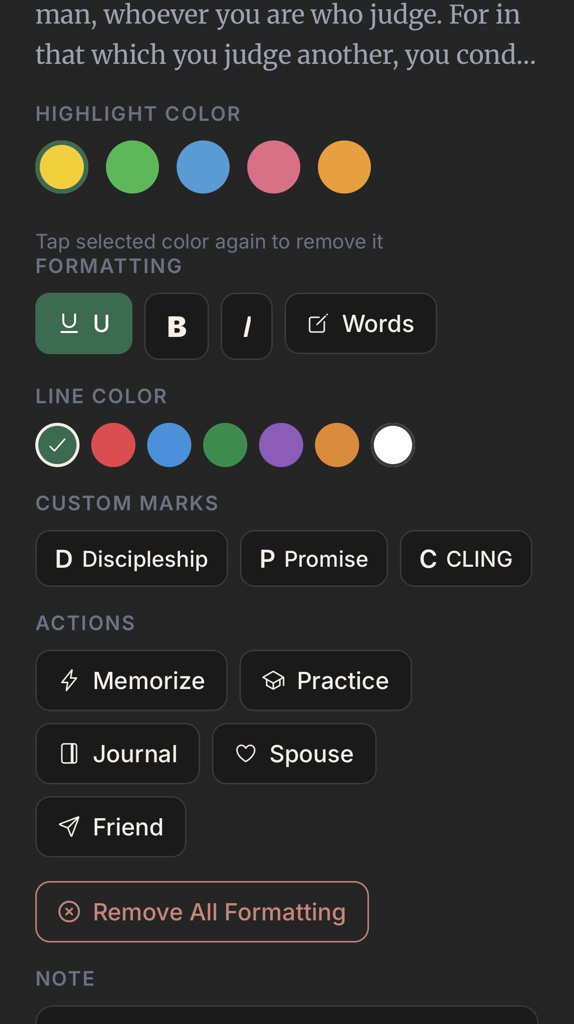 In the actions part you can: add the verse straight to your memory page, you can practice memorizing the verse right on the spot with practice, you can hit the journal button and you will go straight to the journal tab to start writing, then you can share the verse with your spouse in the marriage section or with a friend.