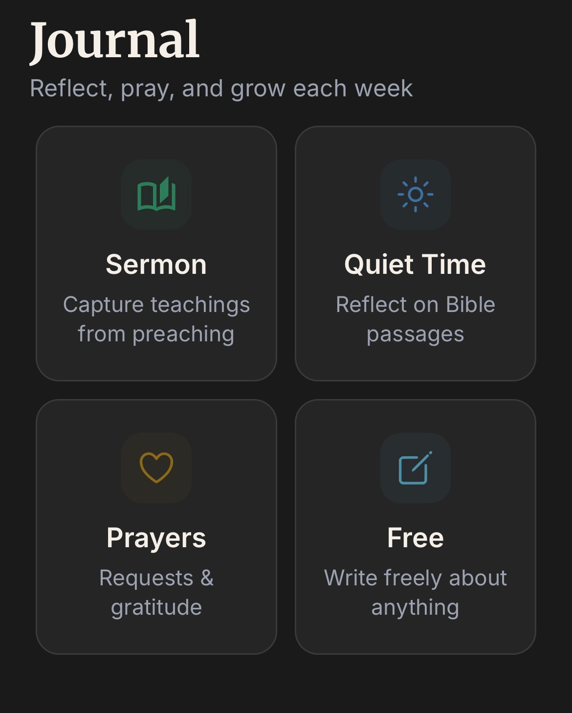 The sermon box allows you to follow along on Sunday morning, the quiet time box guides you through a quiet time with a passage of your choice, the prayer box allows you to write down your prayer list or your prayers in full, and the free box is where you can journal about anything you want. Everything is saved and can be reviewed. If you want to keep it off the app, then go ahead and download everything to your files!