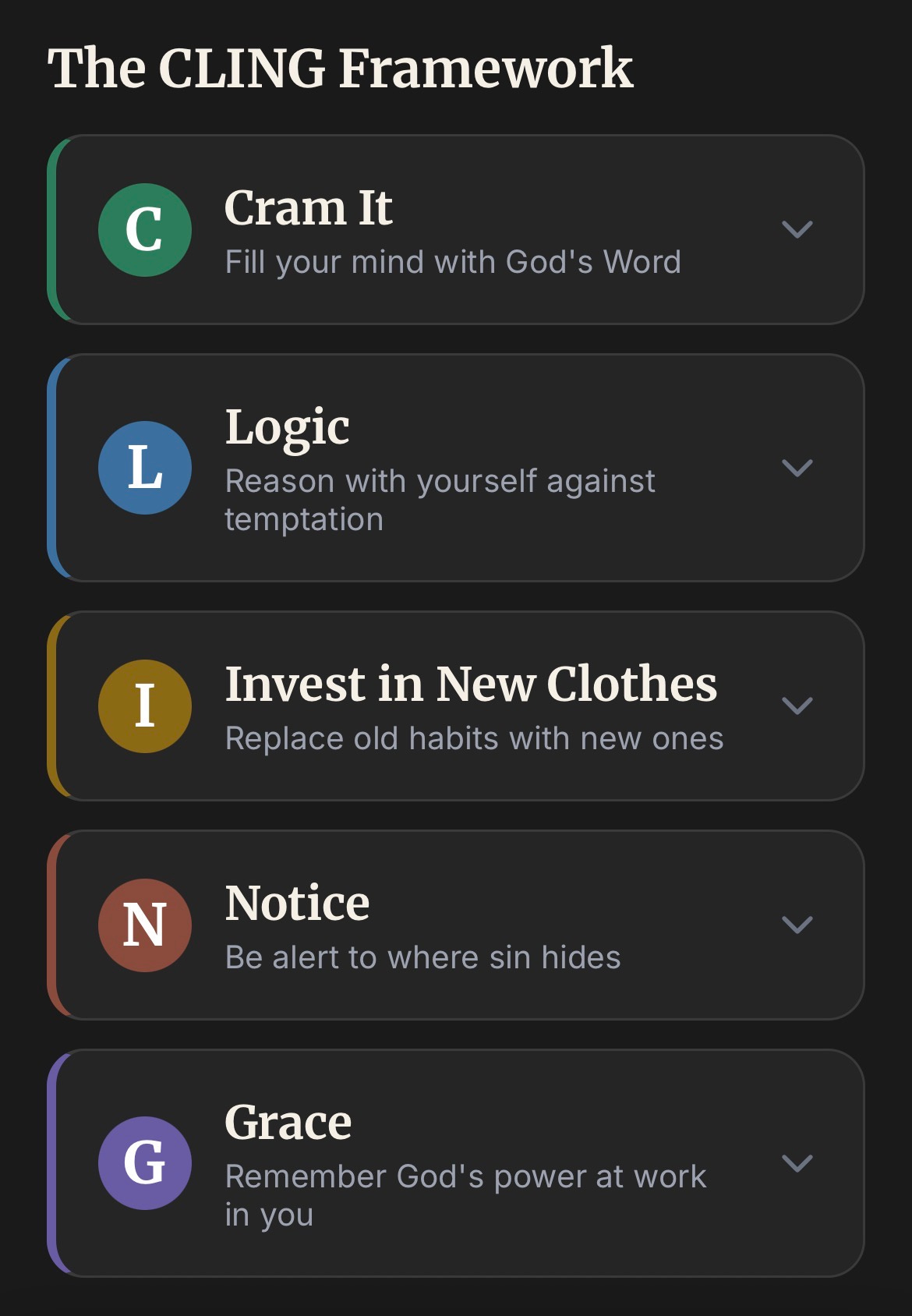 The daily challenge is based off of the C.L.I.N.G acronym I developed in Help On Killing Sin. Each day you receive a challenge based on one of these letters in cling.